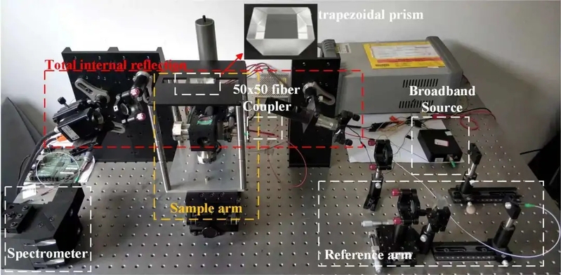通過將棱鏡、濾光片、寬帶光源、工業相機、光纖耦合器等器件精心設計組裝,團隊在全球范圍內首次提出了一種分別利用全內反射(TIR)和光學相干斷層掃描(OCT)同步采集外部指紋和內部指紋的指紋采集系統,結合了兩個完全不同的光路系統,并使用自制的梯形棱鏡將其融合。