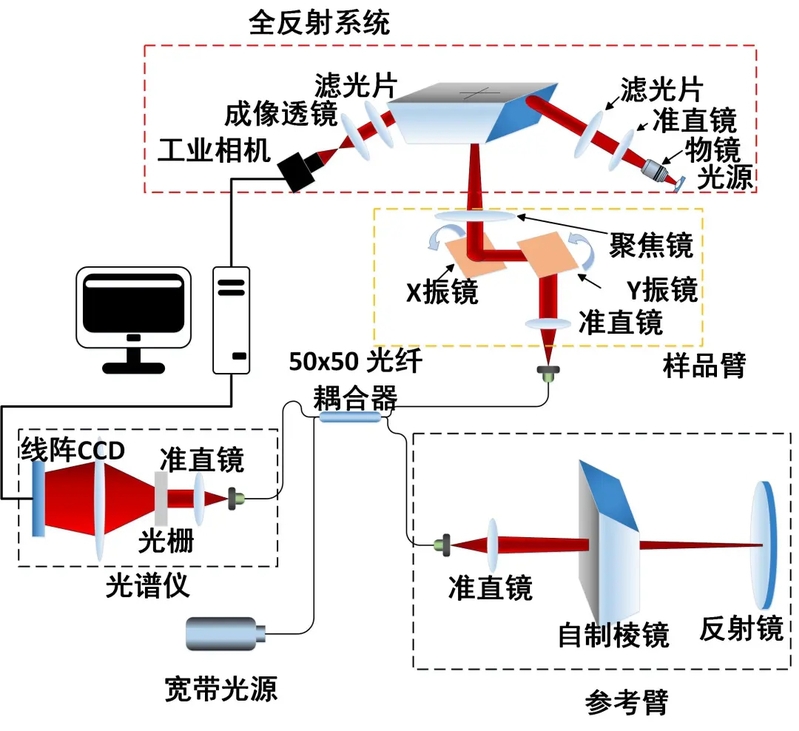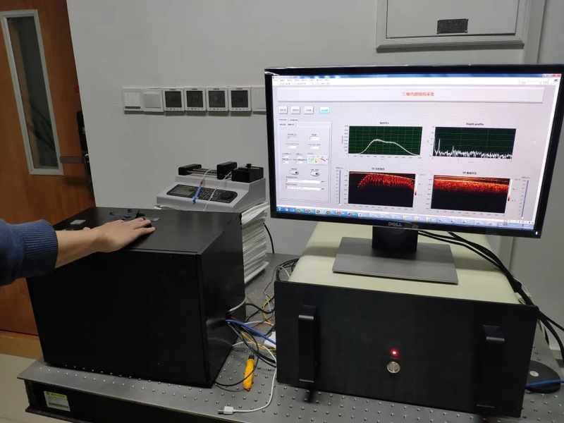 值得一提的是,該系統采用小光斑光纖準直器和長焦透鏡保證光學相干層析成像有足夠的面積,采用自制的梯形棱鏡組合TIR和OCT光路,實現相同的測量面積和同步采集。