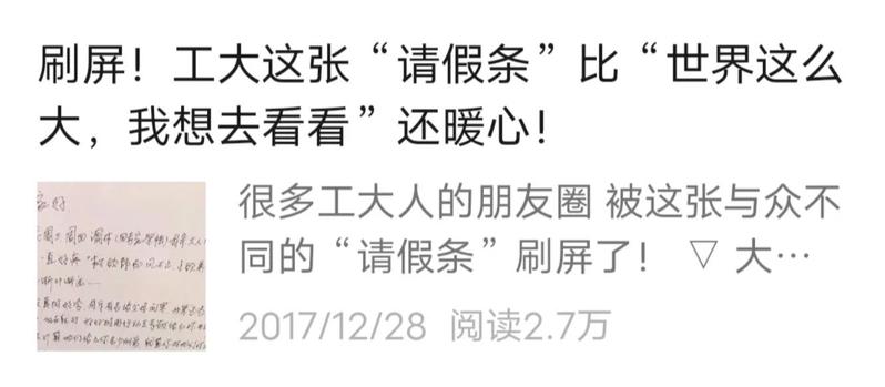 2017年,何師傅的一封請假條在工大眾多師生的朋友圈里引發了一場“小風暴”,官微發布推送《刷屏!工大這張“請假條”比“世界這么大,我想去看看”還暖心!》。
