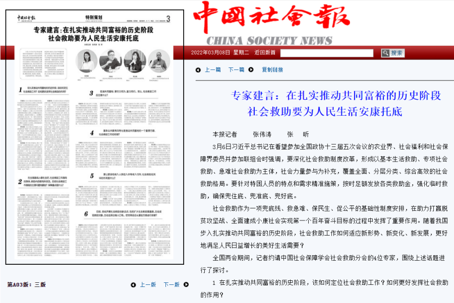 全國兩會期間,《中國社會報》約請中國社會保障學會社會救助分會專家、公共管理學院教授祝建華,圍繞扎實推動共同富裕的新階段中社會救助工作如何適應新形勢、新變化、新發展,更好地滿足人民日益增長的美好生活需要等話題進行探討。采訪報道在《中國社會報》3月8日第三版整版發布。
