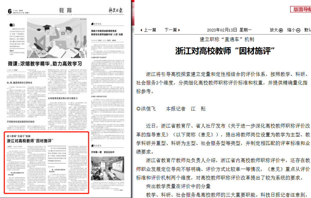 2月13日, 在《科技日報》《建立職稱“直通車”機制 浙江對高校教師“因材施評”》的報道中,我校材料科學與工程學院教授劉育京接受采訪,就浙江省《高校教師評職意見》作出了解讀。