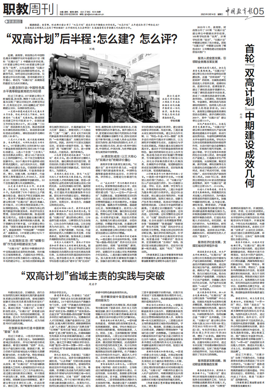 3月14日,《中國教育報》整版刊發我校教育科學與技術學院副院長、浙江省新型高校智庫——職業教育現代化研究中心執行主任劉曉教授團隊關于“中國特色高水平高職學校和專業建設計劃”中期績效評價專題文章《“雙高計劃”后半程:怎么建?怎么評?》。