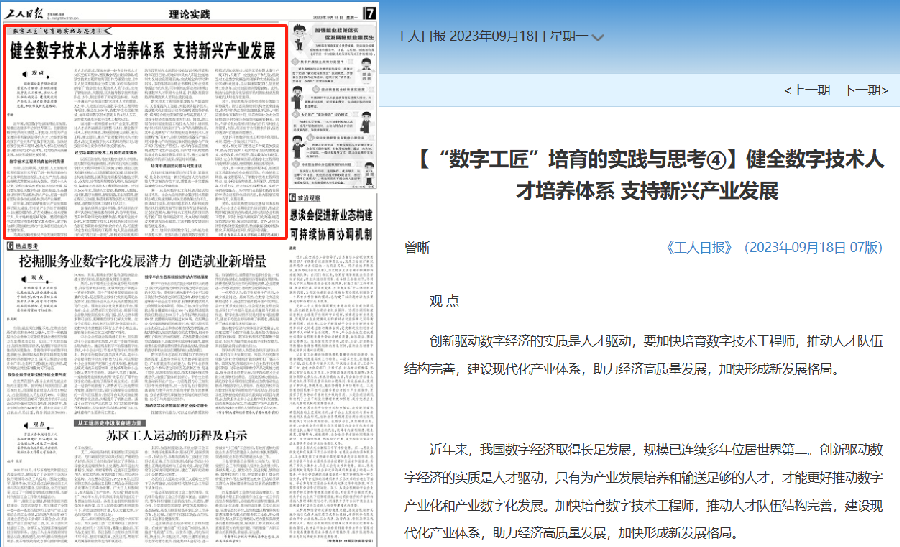 9月18日,《工人日報》刊登我校機械工程學院曾晰教授文章《健全數字技術人才培養體系 支持新興產業發展》。文章中,曾晰就培育數字技術工程師,助力經濟高質量發展展開詳細論述。