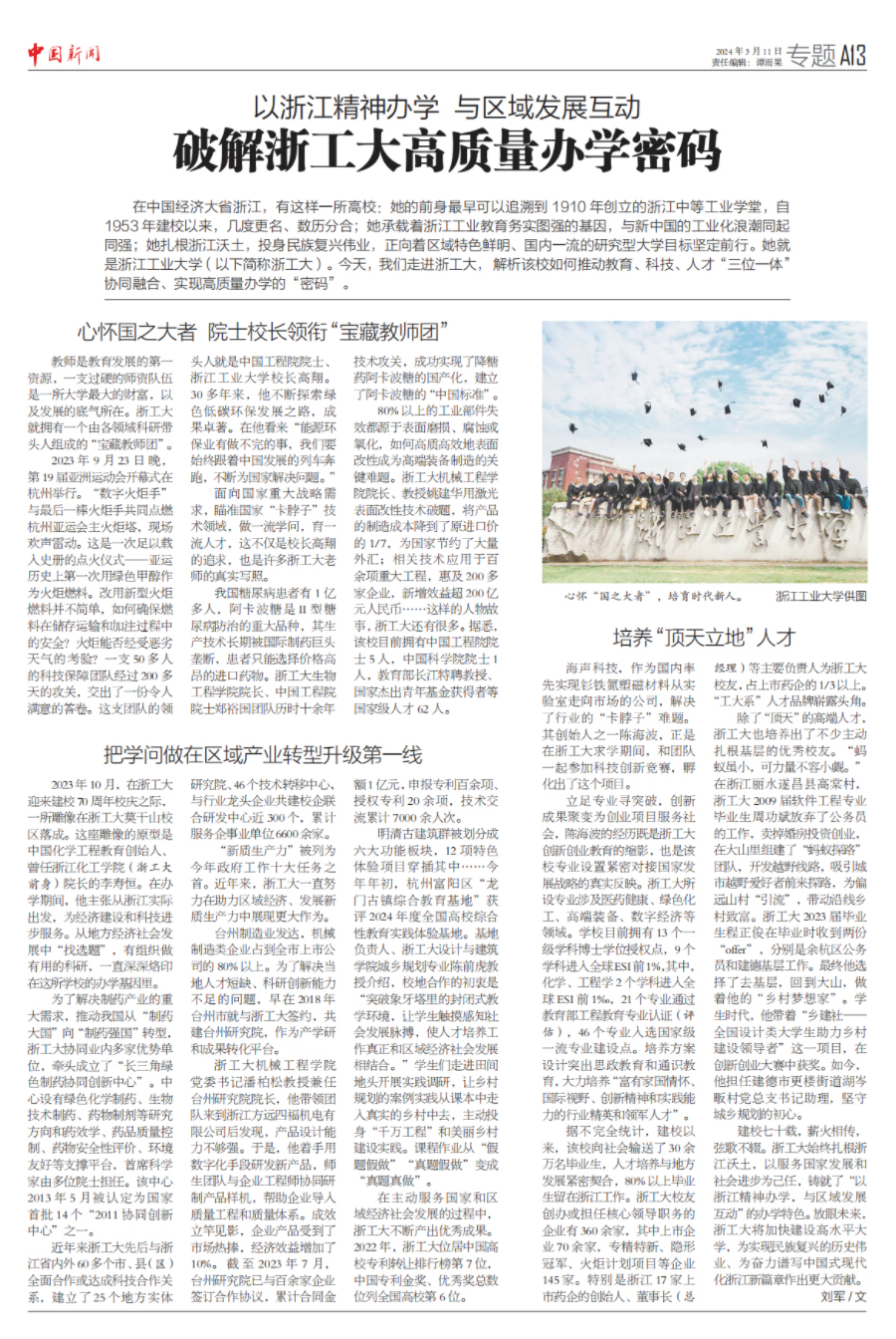 3月11日,《中國新聞》報以《以浙江精神辦學,與區域發展互動——破解浙工大高質量辦學密碼》為題,專版報道學校如何推動教育、科技、人才三位一體協同融合、實現高質量辦學的“密碼”。