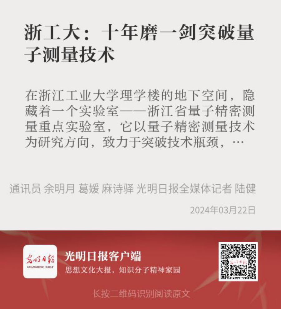 3月22日,《光明日報》客戶端以《浙工大:十年磨一劍突破量子測量技術》為主題,報道浙江工業大學理學院浙江省量子精密測量重點實驗室團隊的科研事跡。據悉,該實驗室團隊以量子精密測量技術為研究方向,致力于突破技術瓶頸,建立完整的理論研究、技術開發、儀器研制、應用示范體系,為國家經濟社會發展服務。