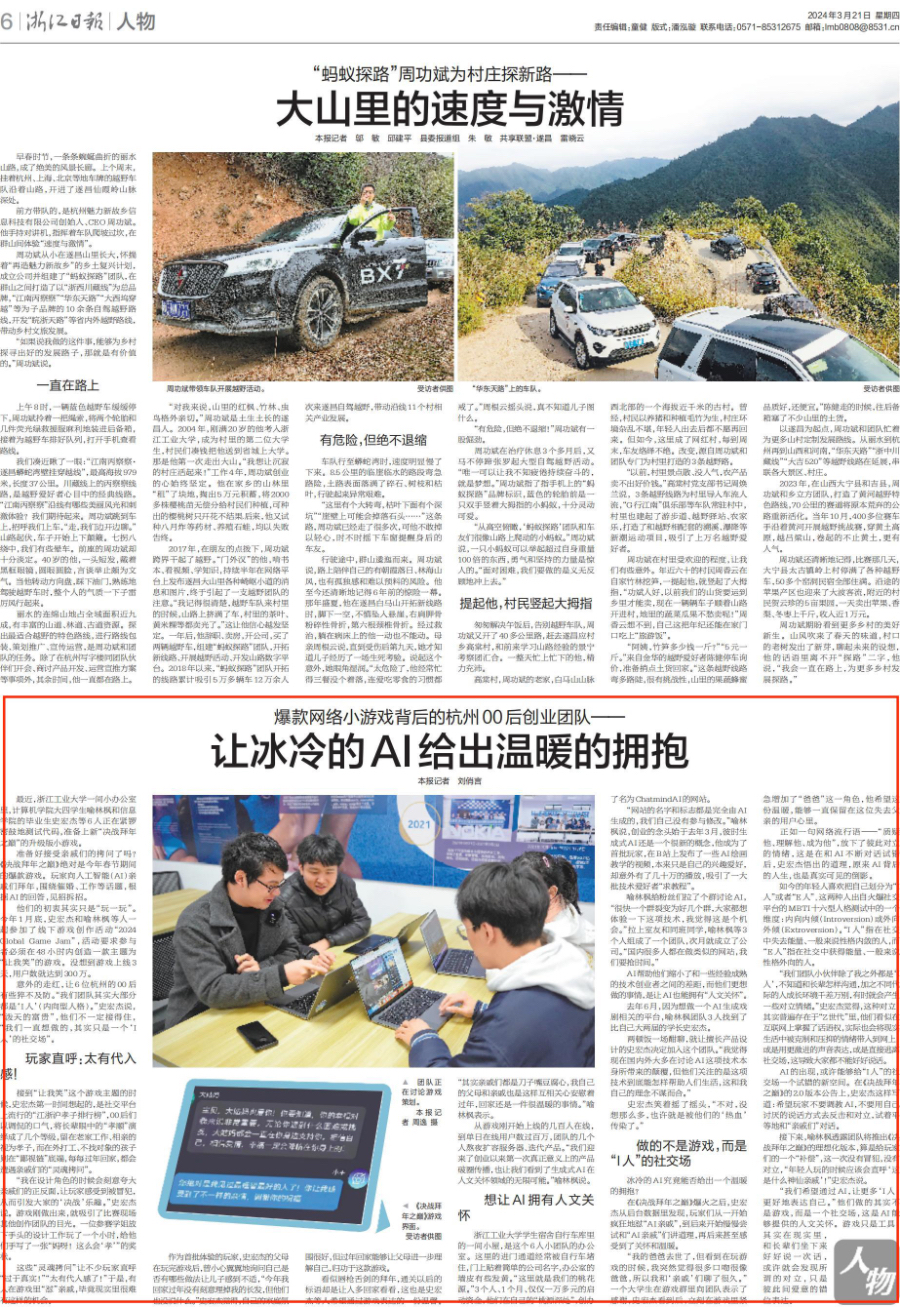 3月21日,《浙江日報》第6版以《爆款網絡小游戲背后的杭州00后創業團隊——讓冰冷的AI給出溫暖的擁抱》為主題,報道了浙江工業大學00后學生團隊通過人工智能技術,打造獨具人文關懷的網絡游戲《決戰拜年之巔》背后的創業故事。