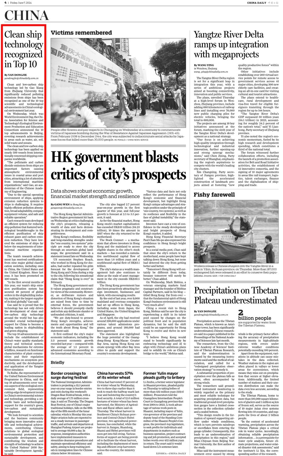 6月7日,《中國日報》報道浙江工業大學校長、中國工程院院士高翔團隊《船舶清潔低碳關鍵技術及應用》成果入選中國生態環境十大科技進展。