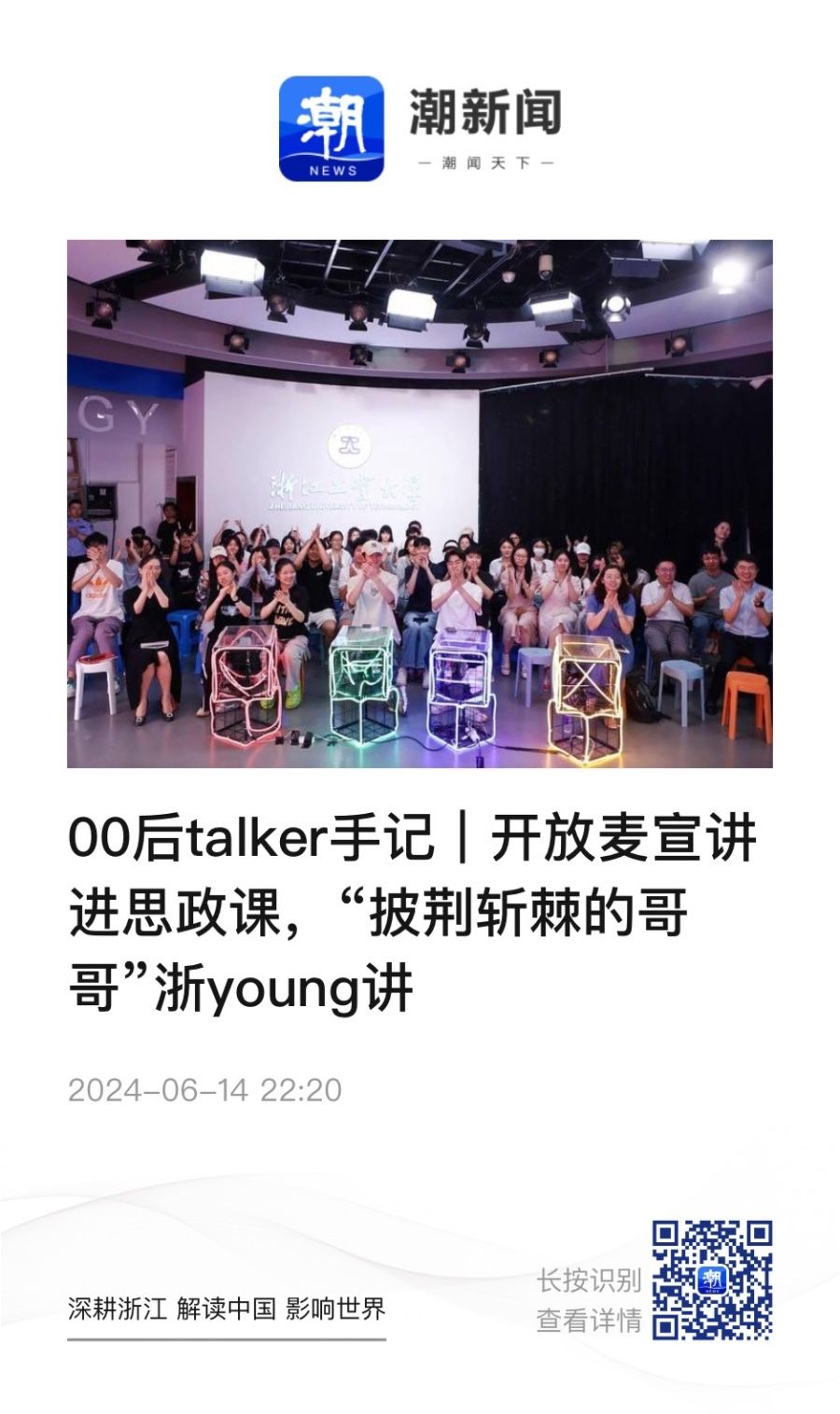 6月14日,潮新聞客戶端報(bào)道思政課“浙young講”——“言之有理”之江潮聲開放麥主題宣講進(jìn)思政課活動首發(fā)浙江工業(yè)大學(xué)。