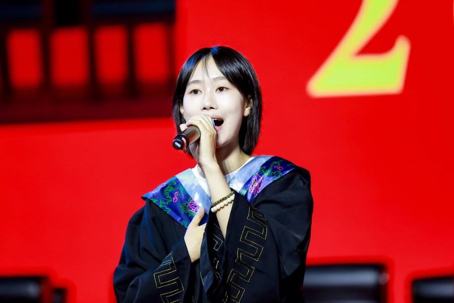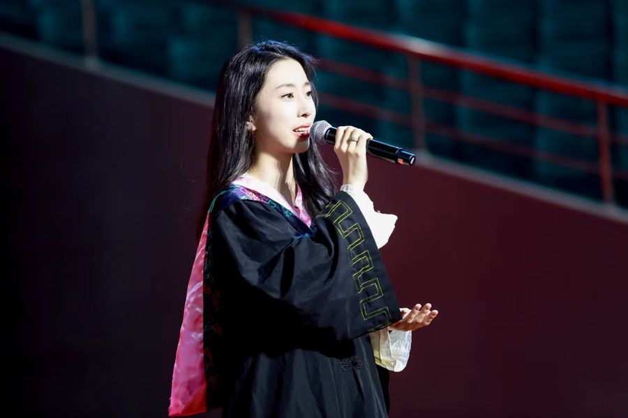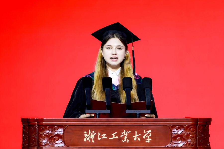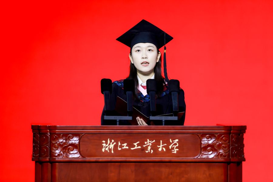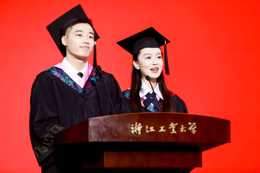 經濟學院國際經濟與貿易專業本科生戚姚維、生物工程學院生物化工專業博士研究生王鵬分別代表本科生、研究生畢業生發言。來自哈薩克斯坦的廣告學專業留學生畢業生代表伊麗娜作為國際學生代表發言。