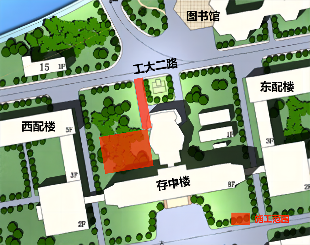 根據學校修繕工程計劃,即將啟動朝暉校區教學區噴淋系統消防水池建設工程。該項目為建設西配樓消防水池,施工期間施工區域道路暫時封閉,禁止停車,施工區域詳見下圖。施工時間74-825日。