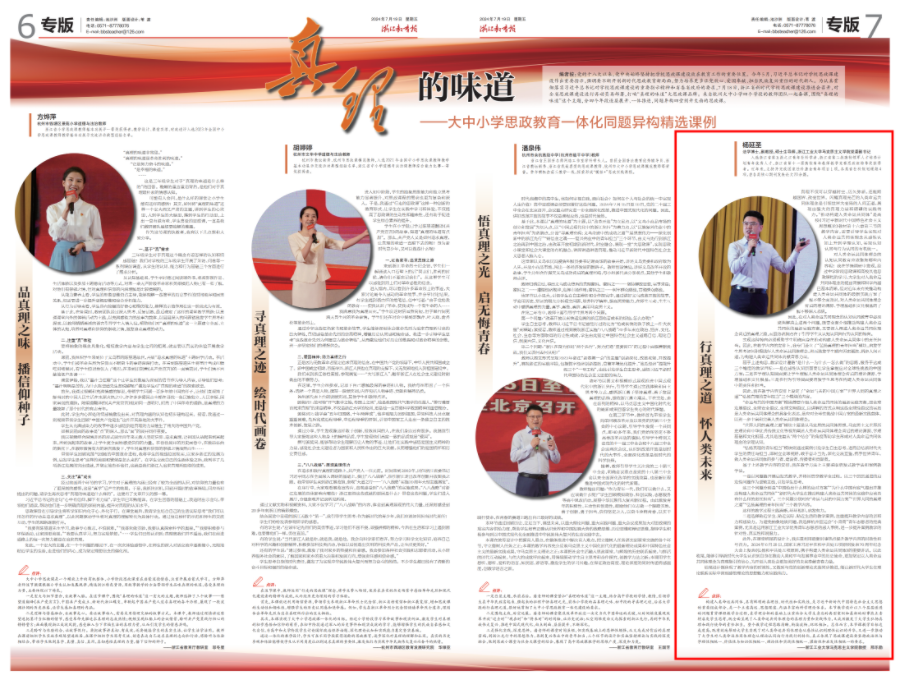 7月19日,《浙江教育報》專版第7版報道以《真理的味道》為主題,報道大中小學思政教育一體化同題異構精選課例。