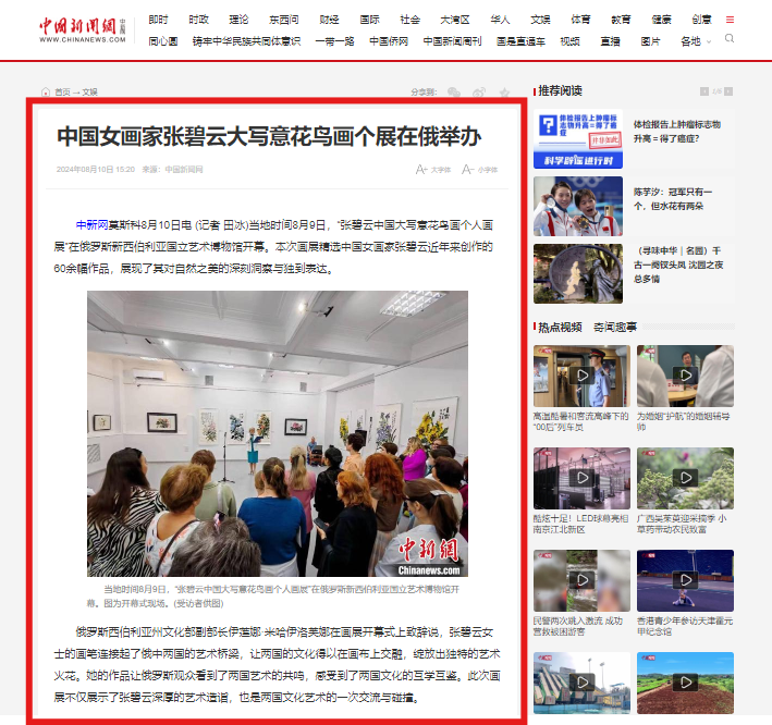 8月10日,中國新聞網以《中國女畫家張碧云大寫意花鳥畫個展在俄舉辦》為主題,報道我校設計與建筑學院教授張碧云。8月9日,“張碧云中國大寫意花鳥畫個人畫展”在俄羅斯新西伯利亞國立藝術博物館開幕。本次畫展精選中國女畫家張碧云近年來創作的60余幅作品,展現了其對自然之美的深刻洞察與獨到表達。