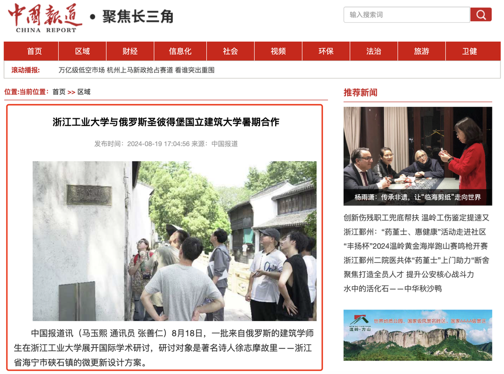 8月19日,中國報(bào)道網(wǎng)報(bào)道我校與俄羅斯圣彼得堡國立建筑大學(xué)合作開展國際化課程教學(xué)。圣彼得堡國立建筑大學(xué)教授Ushakova Olga與助教Parshentseva Arina來到浙江,開展為期三周的授課。共同研討著名詩人徐志摩故里——浙江省海寧市硤石鎮(zhèn)的微更新設(shè)計(jì)方案。