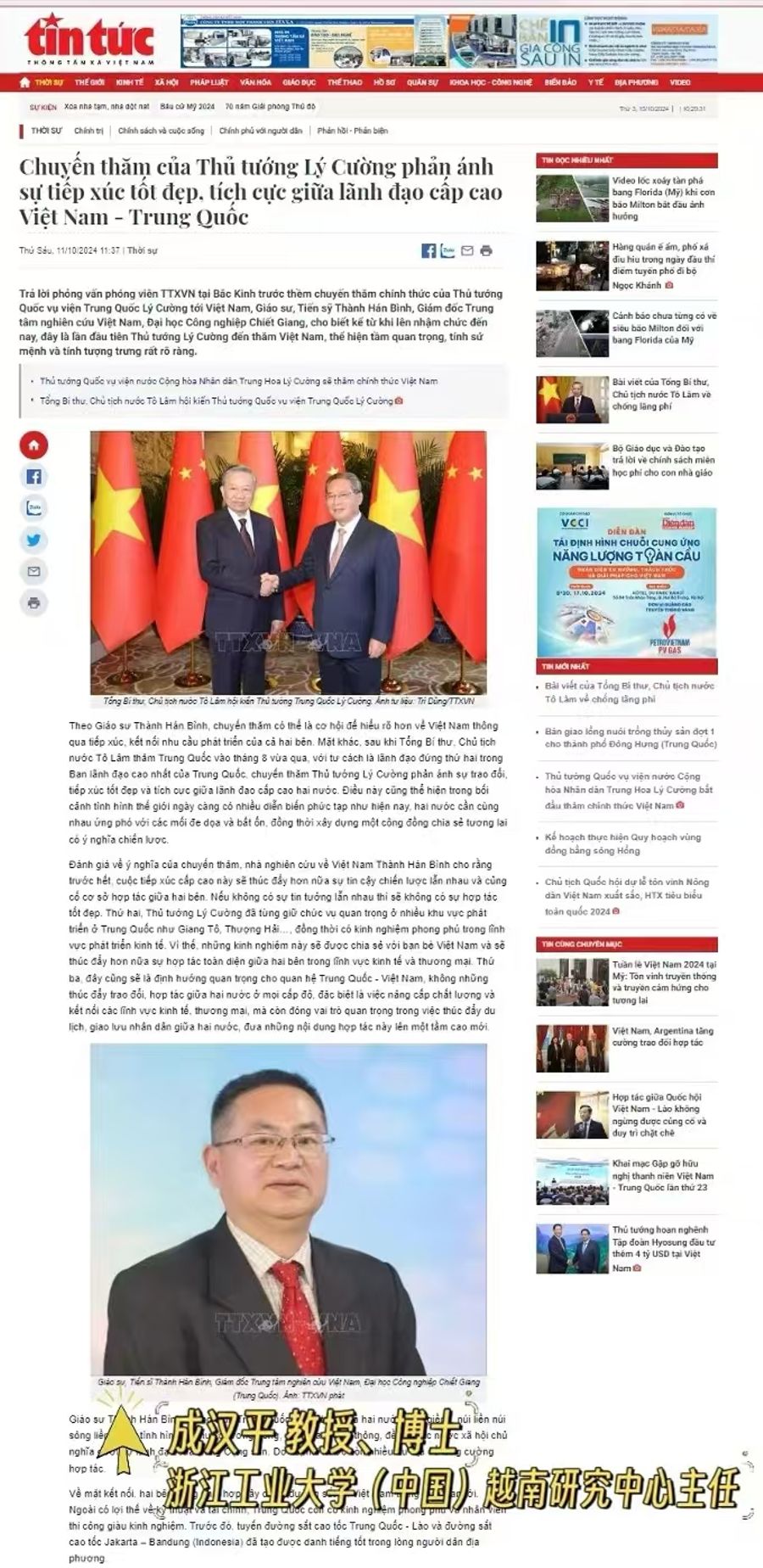 值國務院總理李強訪越之際,浙江工業大學越南研究中心(東南亞研究中心)主任成漢平教授應邀接受越通社駐京記者采訪,談中越關系及此次訪問的重要意義。