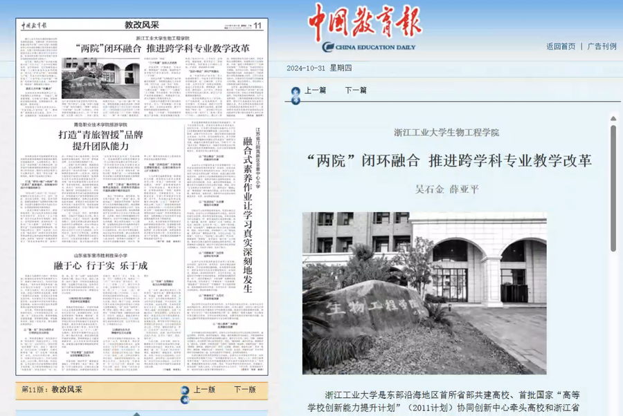 10月31日,《中國教育報》第11版以《“兩院”閉環融合 推進跨學科專業教學改革》為題,報道我校生物工程學院通過構建“專業學院+產業學院”的“一體兩翼”閉環融合育人體系,校企雙方緊抓人才共育“共贏點”,將教育資源與產業資源、科研資源融合配置,實施校企“三個共建”,“互動+聯動”深化產教融合,形成了集項目產出、人才培養、應用研究、創新創業、服務社會于一體的辦學格局,為打通地方區域的人才鏈、產業鏈、創新鏈作出貢獻。