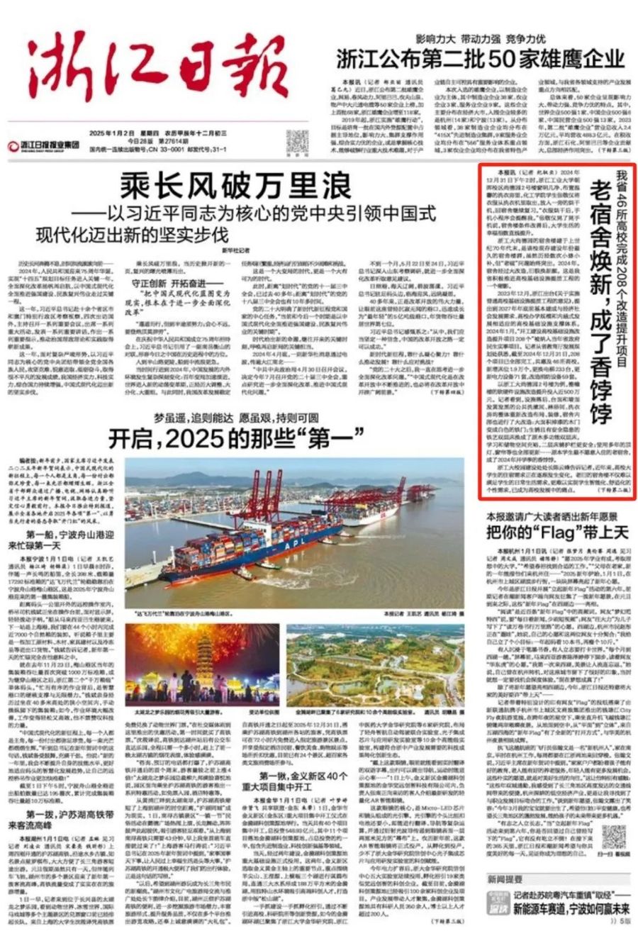 1月2日,《浙江日?qǐng)?bào)》頭版以《老宿舍煥新,成了香餑餑——我省46所高校完成208個(gè)改造提升項(xiàng)目》為題,報(bào)道了浙工大朝暉校區(qū)尚德園宿舍樓經(jīng)過(guò)大改造舊貌換新顏。