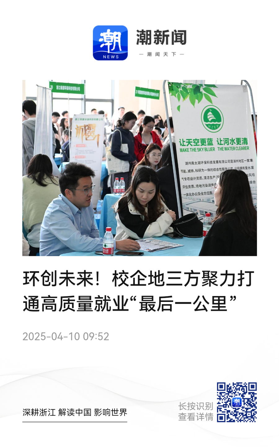 4月10日,潮新聞客戶端以《環創未來!校企地三方聚力打通高質量就業“最后一公里”》為題,報道學校聯合浙江省環境科學學會、杭州市環保產業協會、湖州市環保產業協會等共同舉辦環境類專場招聘會和校企座談會,多措并舉服務畢業生高質量充分就業。