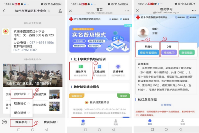 1.報(bào)名參加培訓(xùn)的學(xué)員須關(guān)注“杭州市西湖區(qū)紅十字會(huì)”官方微信服務(wù)號(hào),通過西湖區(qū)紅十字會(huì)微信公眾號(hào)完成在線理論學(xué)習(xí)和模擬練習(xí),打開“杭州市西湖區(qū)紅十字會(huì)”官方微信服務(wù)號(hào),按順序點(diǎn)擊“我要參與”“救護(hù)培訓(xùn)”“理論學(xué)習(xí)”。在線觀看急救知識(shí)視頻,完成20個(gè)必修理論學(xué)習(xí),滿100分為合格;模擬練習(xí)(考試),80分合格。在線理論學(xué)習(xí)路徑如圖所示: