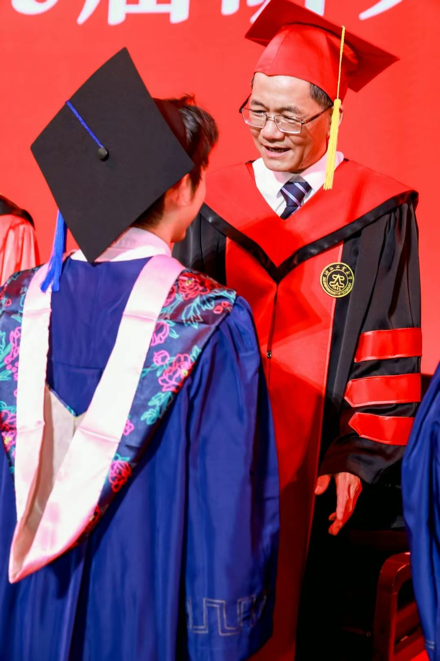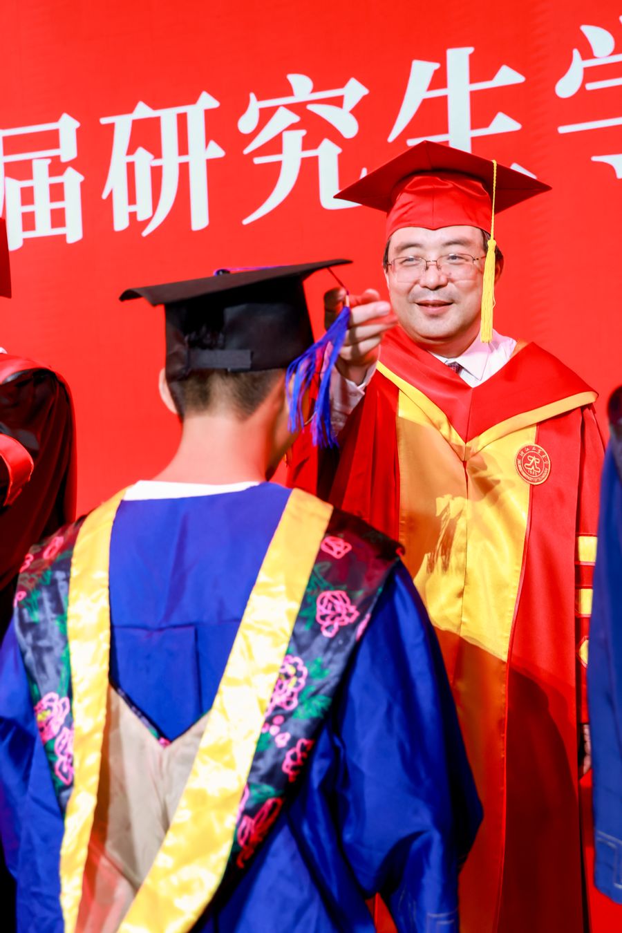 主禮嘉賓為學位獲得者行撥穗禮,授予學位。副校長胡軍宣讀關于授予博士、碩士學位的決定,校黨委副書記吳巨慧主持儀式。