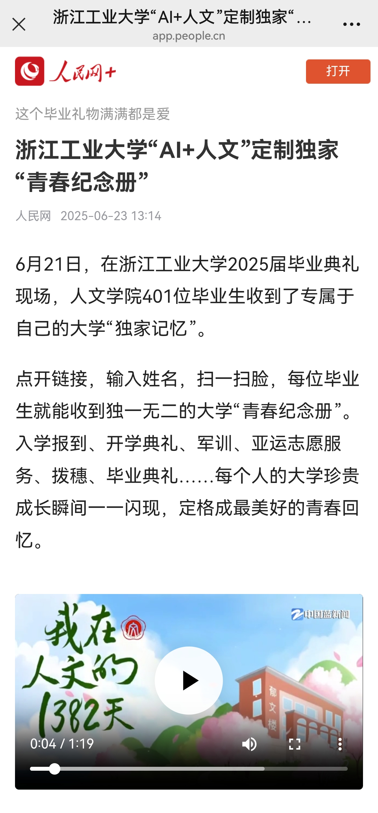 6月21日至23日,人民網等多家媒體報道我校人文學院通過AI剪輯的方式,為401位畢業生量身定制個人專屬大學成長視頻。